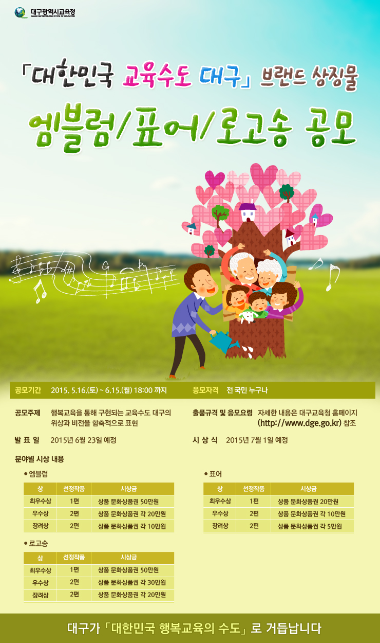 1. 공 모 명 「대한민국 교육수도 대구」브랜드 상징물(엠블럼, 표어, 로고송) 공모 2. 공모기간 2015. 5.16.(토) ~ 6.15.(월) 18:00 까지 3. 응모자격 전 국민 누구나 (※2인 공동 응모 시 대표자 명기) 4. 공모주제 행복교육을 추구하는 교육수도 대구의 위상과 비전을 함축적으로 표현