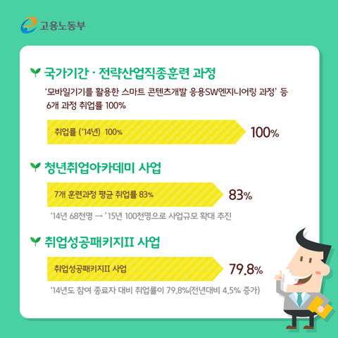 취업성공패키지Ⅱ는 ‘14년도 참여 종료자 대비 취업률이 79.8%(전년대비 4.5% 증가)로 종합적인 취업지원 대표사업으로서 자리매김하고 있습니다. 금번 우수 훈련프로그램에 대한 정보제공을 시작으로 지속적으로 프로그램을 발굴, 업데이트하여 청년에게 밀착 제공할 계획입니다. |