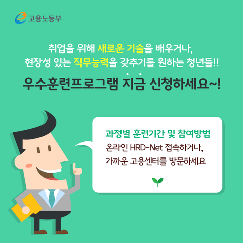 많은 청년들이 일자리 찾기에 큰 어려움을 겪고 있는데요~ 취업을 위해 새로운 기술을 배우거나, 보다 현장성 있는 직무능력을 갖추기를 원하는 청년들!!! 어서어서 모이세요!! 우수훈련 프로그램 정보 받고, 기업이 원하는 취업 지름길을 알고, 취업 성공문을 여세요~!
